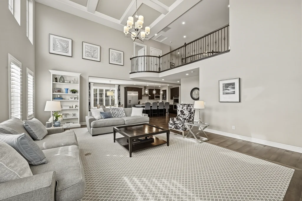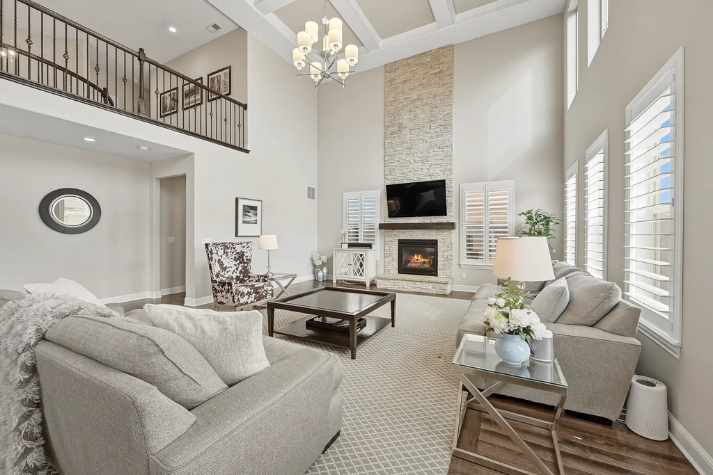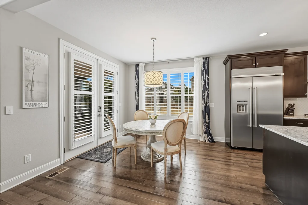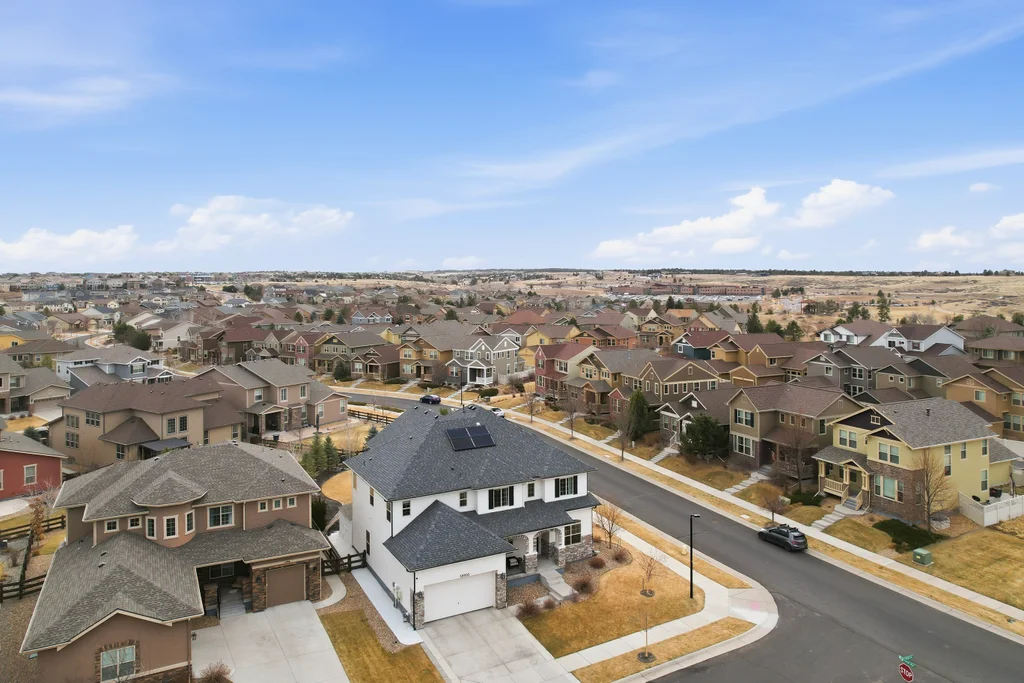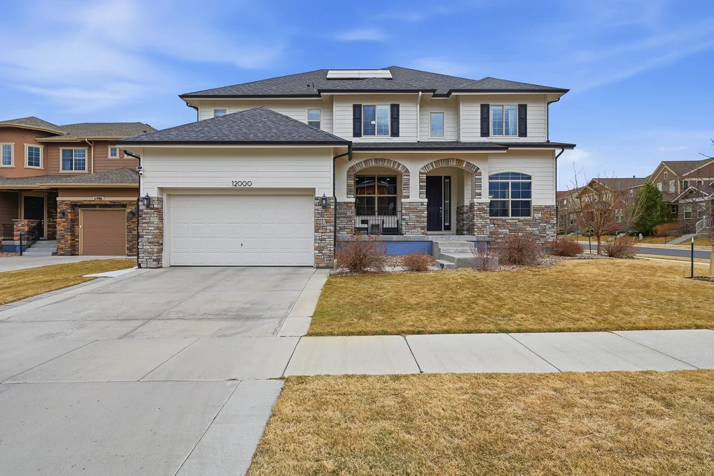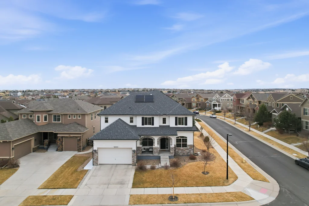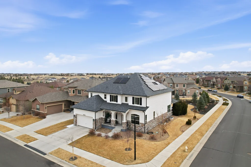 Step into a beautifully upgraded residence where thoughtful design meets everyday comfort. A striking curved staircase welcomes you, leading to a main level that immediately impresses with a breathtaking living room defined by soaring ceilings and an abundance of windows that flood the space with natural light, creating an airy, dramatic setting. The layout blends elegance and function with a private office behind French doors and a formal dining room perfectly positioned to capture scenic mountain views. The gourmet kitchen is equally impressive, featuring double ovens, a 5-burner gas range, an upgraded built-in refrigerator, soft-close cherry cabinetry, an oversized island, and a butler’s pantry, all flowing effortlessly into a sun-filled breakfast nook and out to the extended patio with pergola and flat, usable backyard — a perfect setting for weekend gatherings or relaxing evenings. Complementing the stunning visual appeal are behind-the-scenes upgrades, including structural and efficiency improvements, ensuring lasting quality, comfort, and value. Upstairs, the luxurious primary suite offers a tray ceiling, warm hardwood flooring paired with a luxurious carpet detail, a spa-inspired bath, and a spacious walk-in closet. A private guest suite and Jack-and-Jill bedrooms provide ideal flexibility, and mountain views can be captured from most of the upstairs bedrooms. The finished basement adds two additional bedrooms, a wet bar, and generous entertaining space. This home is located in the highly desirable Idyllwilde community and is situated on a landscaped ¼-acre corner lot with solar panels and an extended 3-car garage wired for EV charging. With access to a charming community coffee house, sparkling pool, clubhouse, scenic trail system, pocket parks, food trucks, neighborhood events, and schools within walking distance, every day here feels like something special. Welcome to a home that stands out for all the right reasons — where no detail was missed.