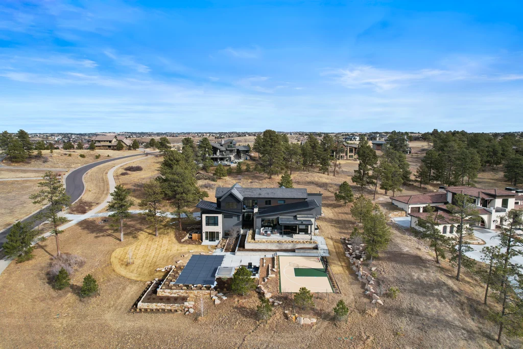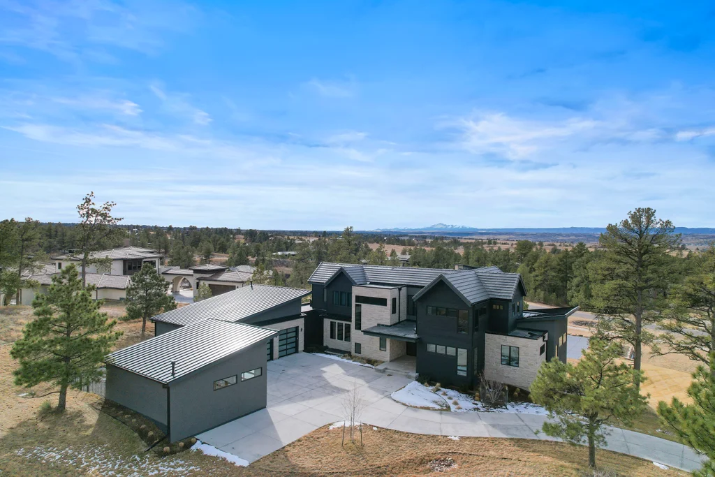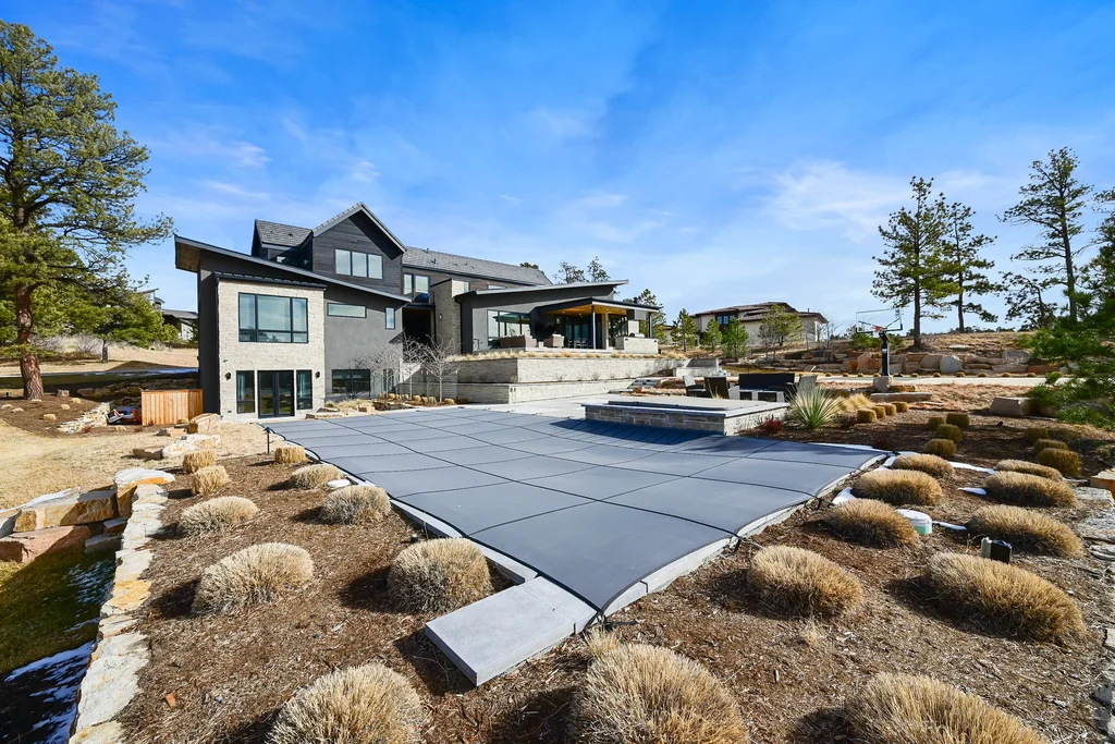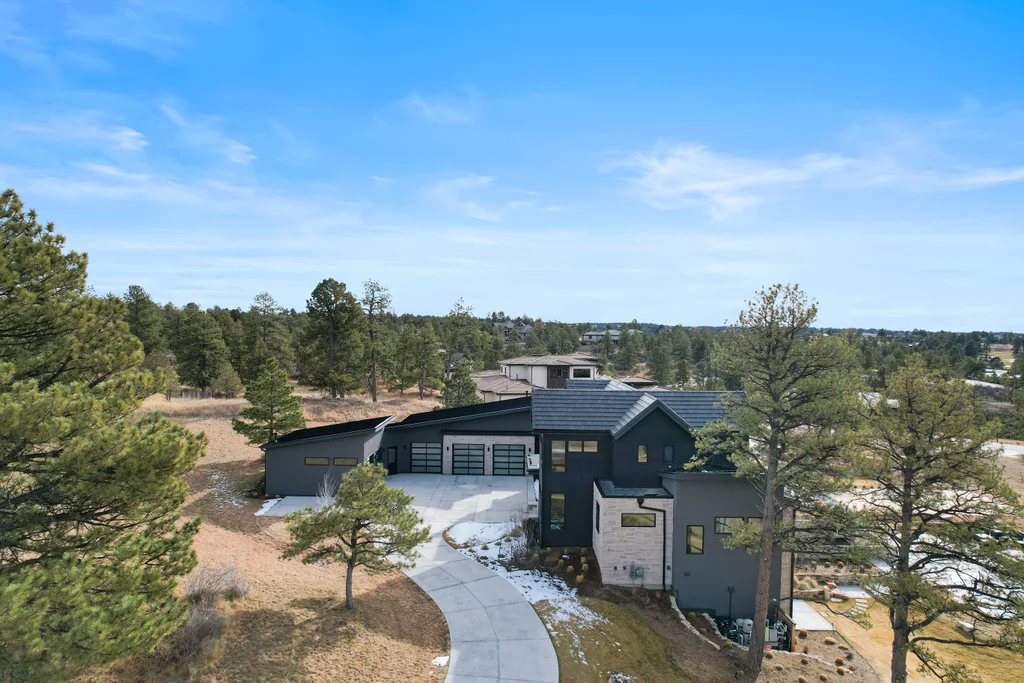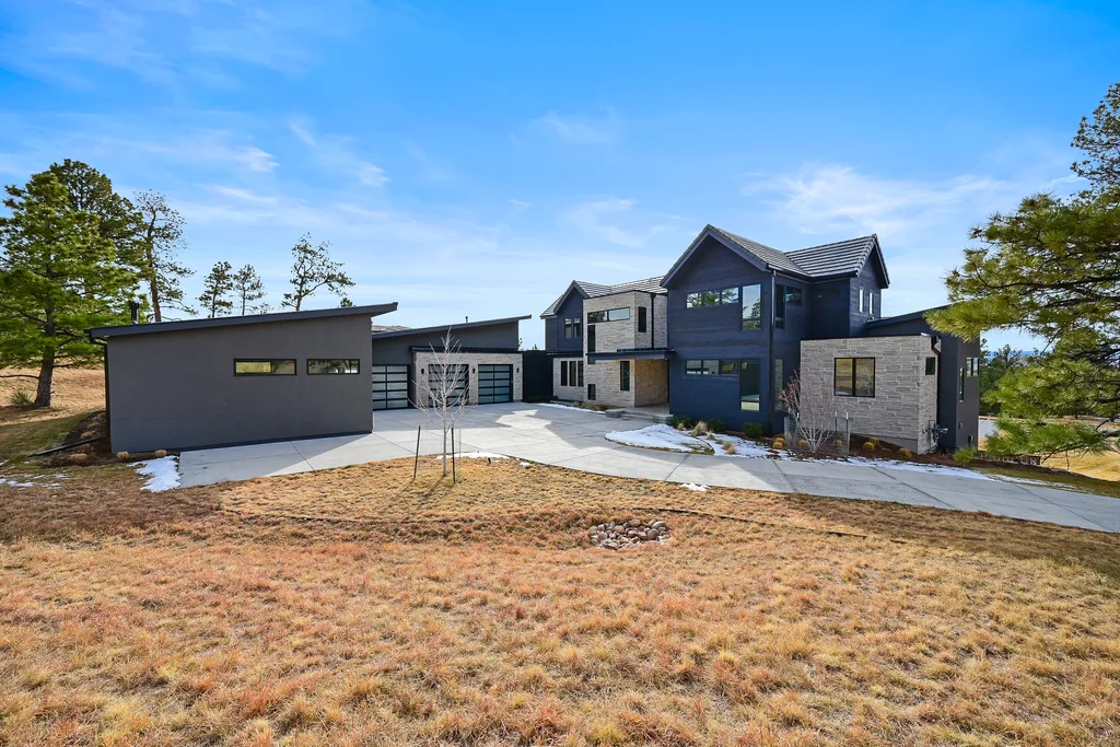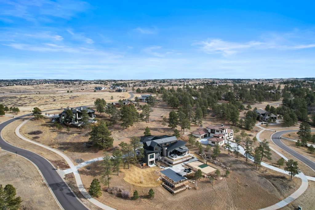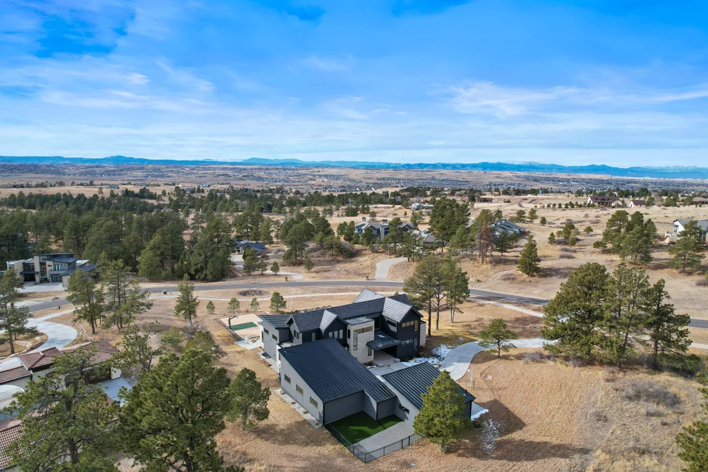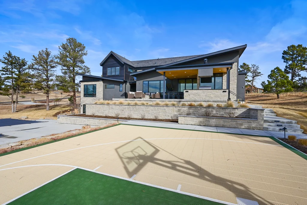 This extraordinary custom residence blends modern architecture, luxury design, and resort-style living on a breathtaking, private setting. Thoughtfully crafted with soaring ceilings, wide-plank hardwood floors, and walls of windows, the home is filled with natural light and showcases stunning mountain and acreage views throughout. The heart of the home is an open-concept living space anchored by a chef's kitchen with bold soapstone double islands, premium appliances, a cleverly concealed behind seamless cabinet front walk-in pantry, and seamless flow into elegant dining and gathering areas-perfect for both everyday living and grand entertaining. The primary suite is a true retreat, offering a serene bedroom, spa-inspired bath with soaking tub and dual vanities, a gorgeous walk-in closet, and a convenient main-level laundry just steps away. Additional bedrooms are spacious and beautifully appointed, providing comfort and flexibility for family and guests. The lower level is an entertainer's dream, featuring a full custom bar, expansive recreation space, media area, and a private guest suite with an attached designer bath, coffee bar with beverage refrigerator-ideal for visitors or multi-generational living. Outdoor living rivals that of a luxury resort with a covered patio complete with built-in grill, covered dining area, multiple seating zones, firepit and panoramic views. The grounds are equally impressive, offering a sports court, pool area, hot tub, terraced patios, and tranquil spaces to unwind and take in Colorado's natural beauty. A gated dog run, stunning landscaping, and expansive 5- car heated garage complete this exceptional property. This is more than a home-it's a lifestyle of elegance, comfort, and unforgettable living.