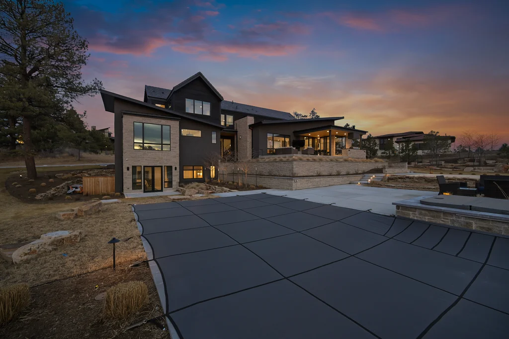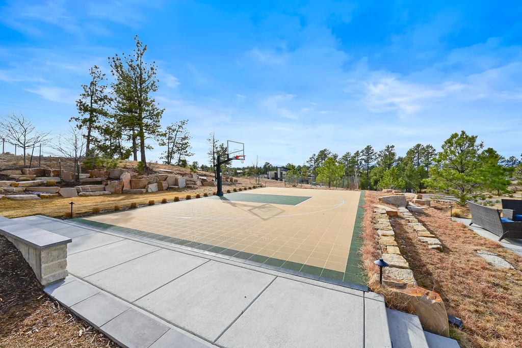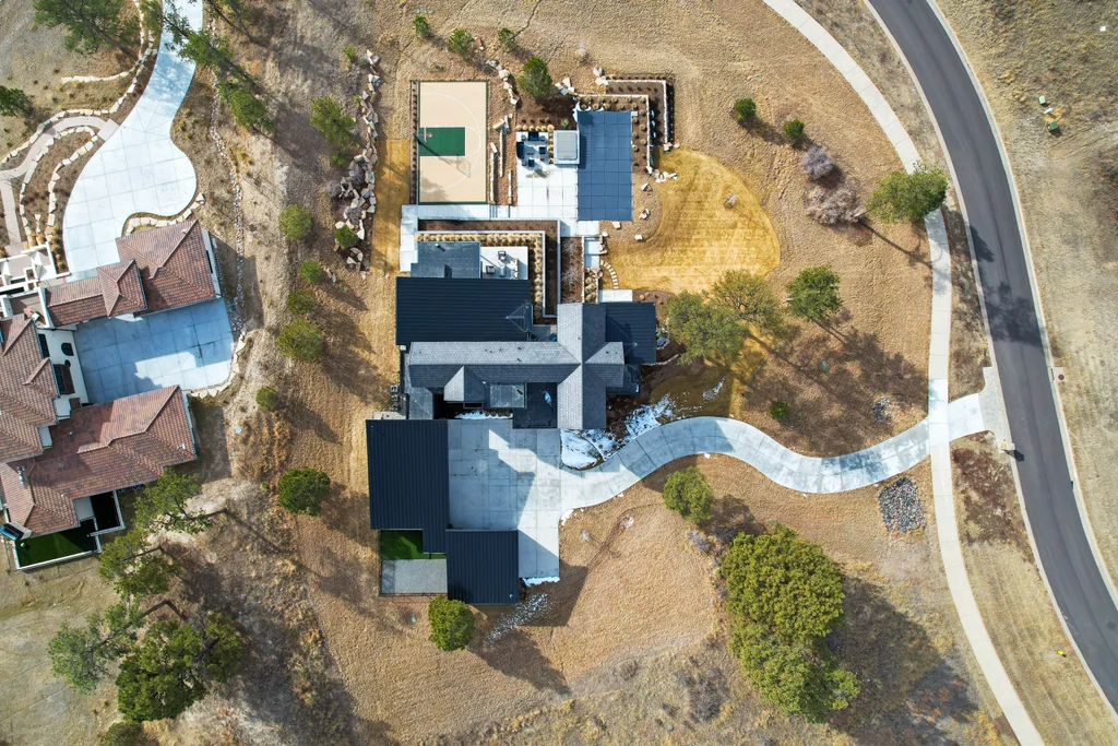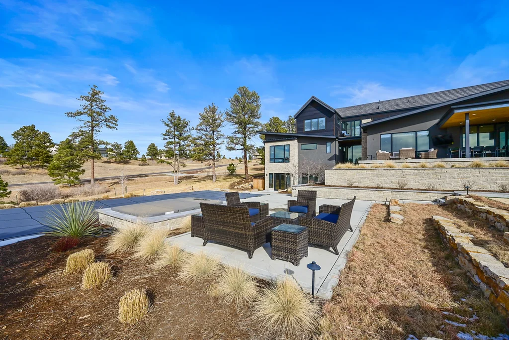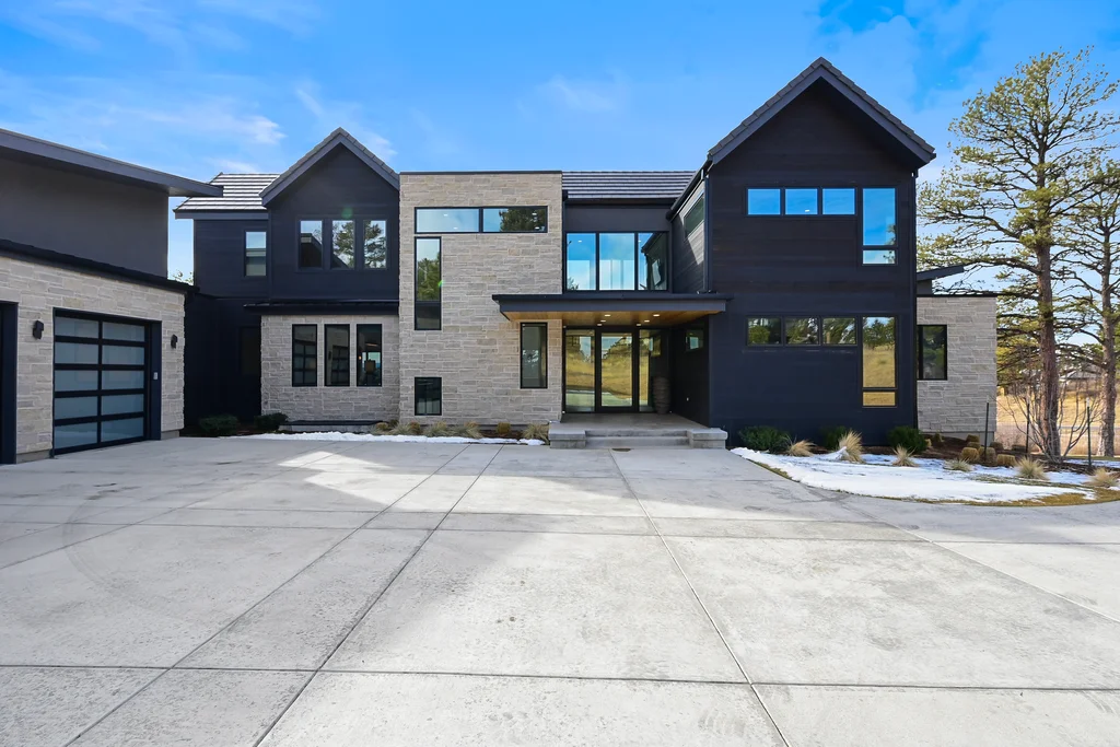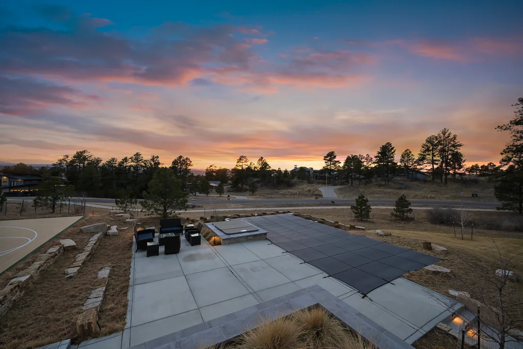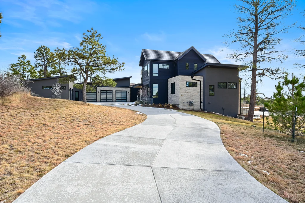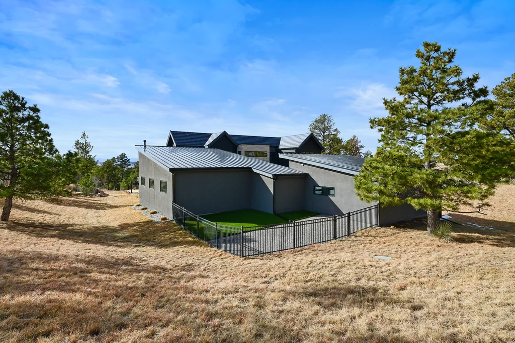 This extraordinary custom residence blends modern architecture, luxury design, and resort-style living on a breathtaking, private setting. Thoughtfully crafted with soaring ceilings, wide-plank hardwood floors, and walls of windows, the home is filled with natural light and showcases stunning mountain and acreage views throughout. The heart of the home is an open-concept living space anchored by a chef's kitchen with bold soapstone double islands, premium appliances, a cleverly concealed behind seamless cabinet front walk-in pantry, and seamless flow into elegant dining and gathering areas-perfect for both everyday living and grand entertaining. The primary suite is a true retreat, offering a serene bedroom, spa-inspired bath with soaking tub and dual vanities, a gorgeous walk-in closet, and a convenient main-level laundry just steps away. Additional bedrooms are spacious and beautifully appointed, providing comfort and flexibility for family and guests. The lower level is an entertainer's dream, featuring a full custom bar, expansive recreation space, media area, and a private guest suite with an attached designer bath, coffee bar with beverage refrigerator-ideal for visitors or multi-generational living. Outdoor living rivals that of a luxury resort with a covered patio complete with built-in grill, covered dining area, multiple seating zones, firepit and panoramic views. The grounds are equally impressive, offering a sports court, pool area, hot tub, terraced patios, and tranquil spaces to unwind and take in Colorado's natural beauty. A gated dog run, stunning landscaping, and expansive 5- car heated garage complete this exceptional property. This is more than a home-it's a lifestyle of elegance, comfort, and unforgettable living.