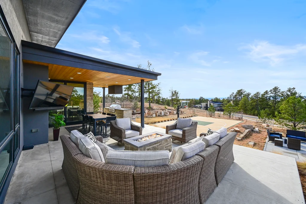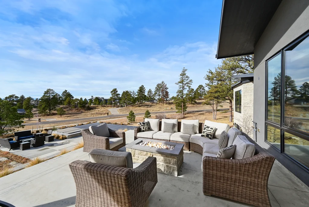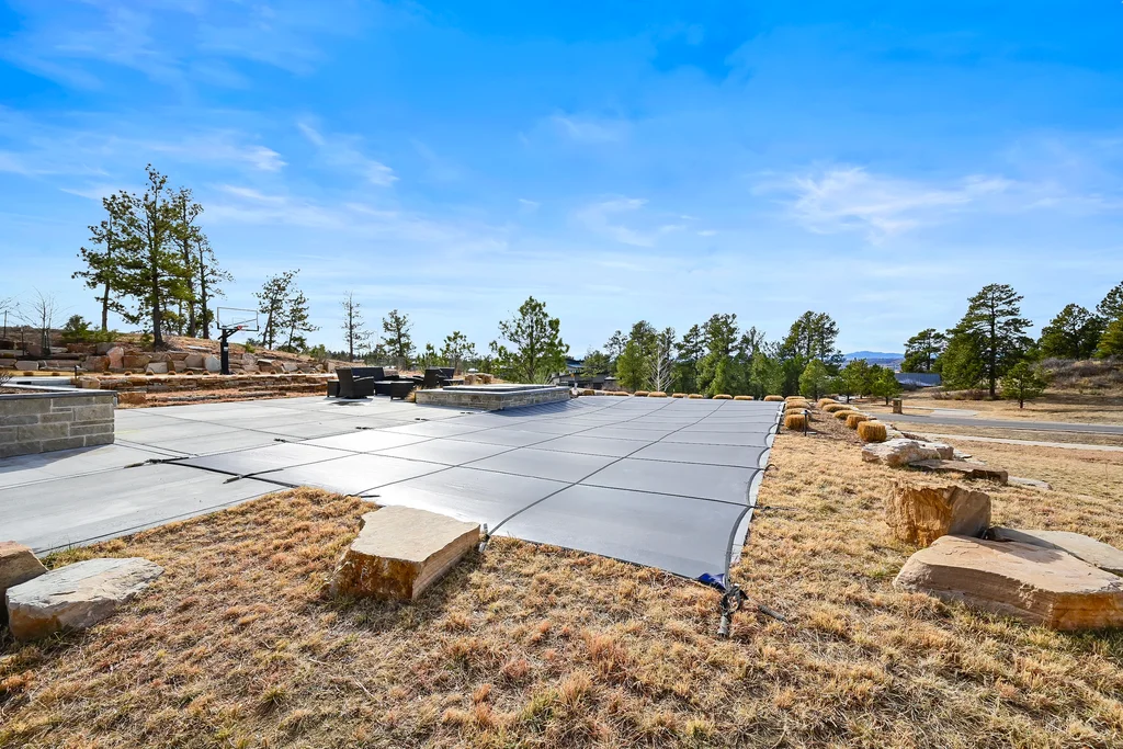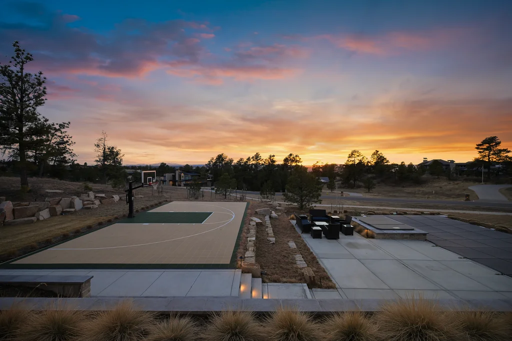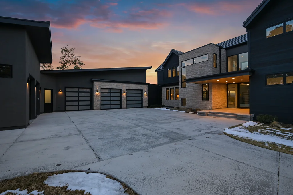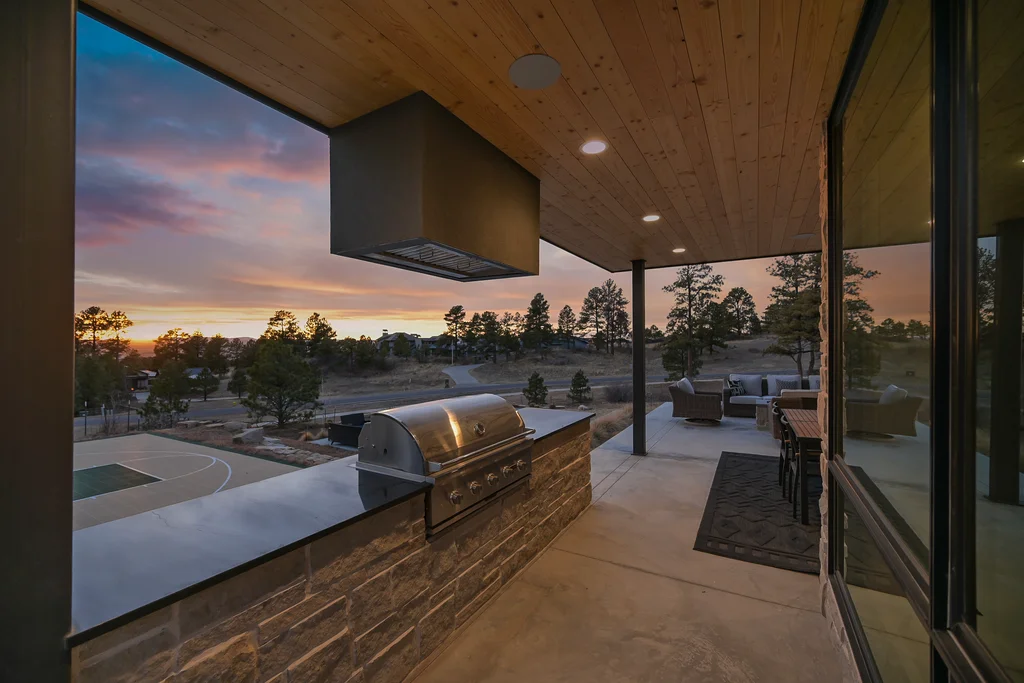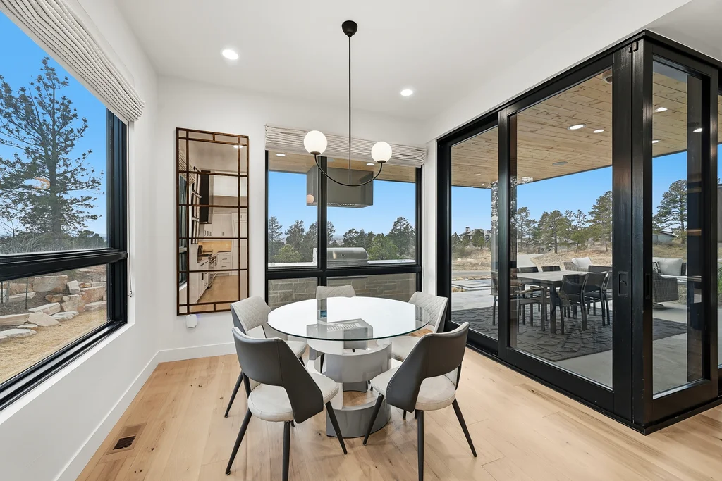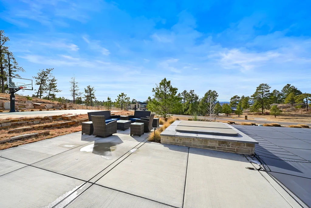 This extraordinary custom residence blends modern architecture, luxury design, and resort-style living on a breathtaking, private setting. Thoughtfully crafted with soaring ceilings, wide-plank hardwood floors, and walls of windows, the home is filled with natural light and showcases stunning mountain and acreage views throughout. The heart of the home is an open-concept living space anchored by a chef's kitchen with bold soapstone double islands, premium appliances, a cleverly concealed behind seamless cabinet front walk-in pantry, and seamless flow into elegant dining and gathering areas-perfect for both everyday living and grand entertaining. The primary suite is a true retreat, offering a serene bedroom, spa-inspired bath with soaking tub and dual vanities, a gorgeous walk-in closet, and a convenient main-level laundry just steps away. Additional bedrooms are spacious and beautifully appointed, providing comfort and flexibility for family and guests. The lower level is an entertainer's dream, featuring a full custom bar, expansive recreation space, media area, and a private guest suite with an attached designer bath, coffee bar with beverage refrigerator-ideal for visitors or multi-generational living. Outdoor living rivals that of a luxury resort with a covered patio complete with built-in grill, covered dining area, multiple seating zones, firepit and panoramic views. The grounds are equally impressive, offering a sports court, pool area, hot tub, terraced patios, and tranquil spaces to unwind and take in Colorado's natural beauty. A gated dog run, stunning landscaping, and expansive 5- car heated garage complete this exceptional property. This is more than a home-it's a lifestyle of elegance, comfort, and unforgettable living.