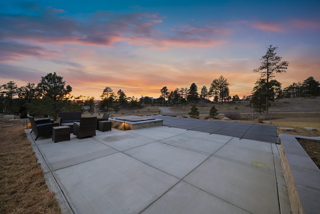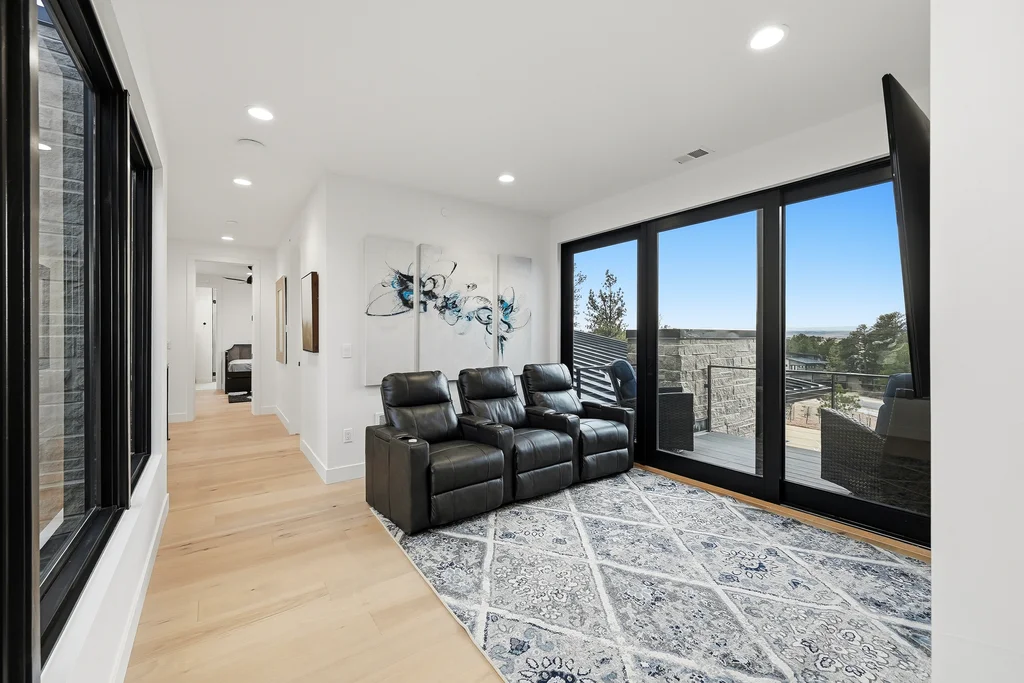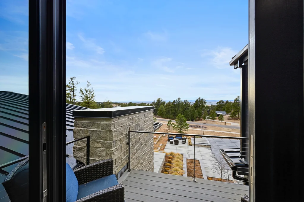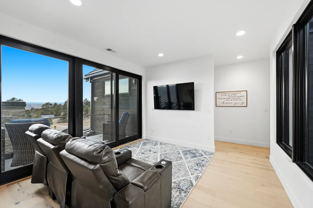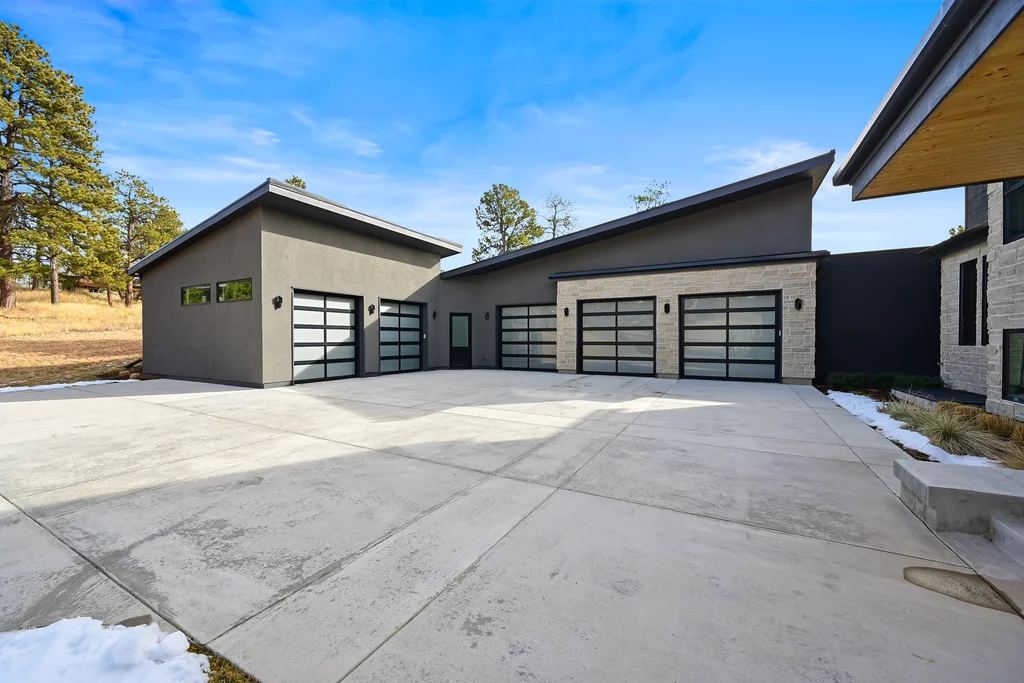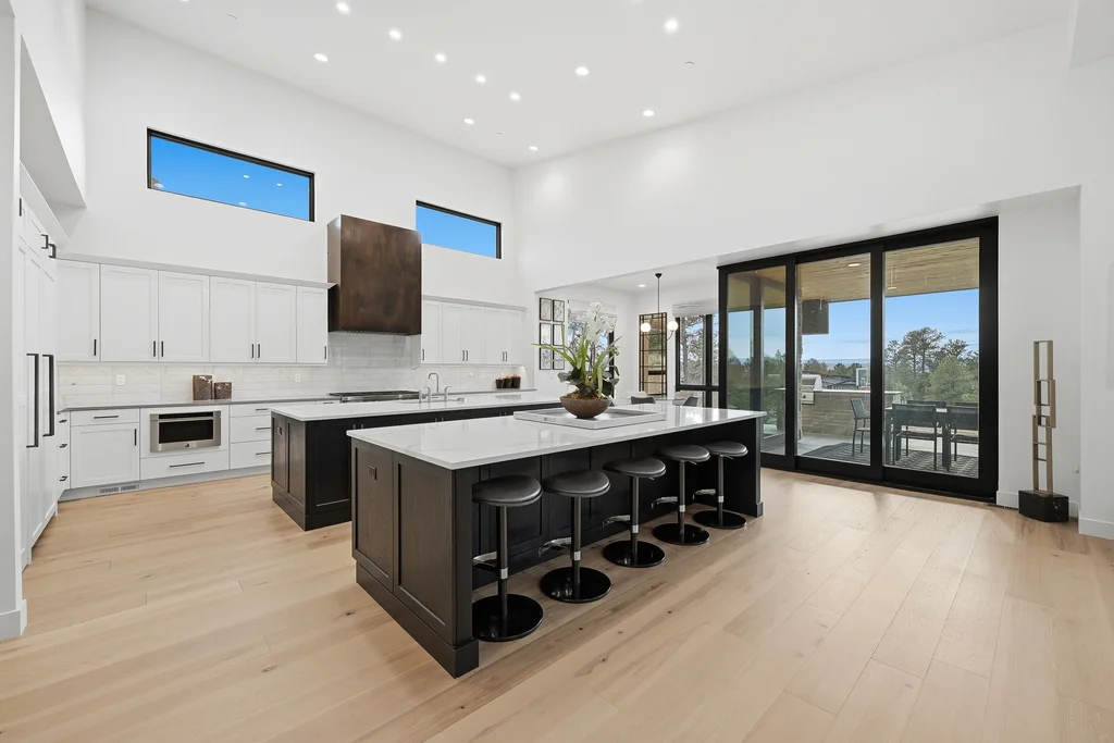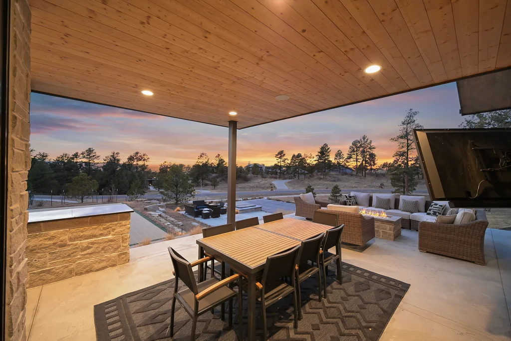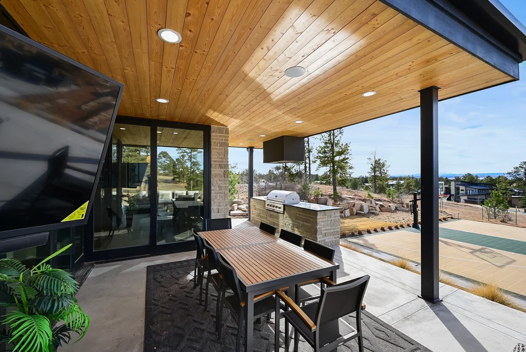 This extraordinary custom residence blends modern architecture, luxury design, and resort-style living on a breathtaking, private setting. Thoughtfully crafted with soaring ceilings, wide-plank hardwood floors, and walls of windows, the home is filled with natural light and showcases stunning mountain and acreage views throughout. The heart of the home is an open-concept living space anchored by a chef's kitchen with bold soapstone double islands, premium appliances, a cleverly concealed behind seamless cabinet front walk-in pantry, and seamless flow into elegant dining and gathering areas-perfect for both everyday living and grand entertaining. The primary suite is a true retreat, offering a serene bedroom, spa-inspired bath with soaking tub and dual vanities, a gorgeous walk-in closet, and a convenient main-level laundry just steps away. Additional bedrooms are spacious and beautifully appointed, providing comfort and flexibility for family and guests. The lower level is an entertainer's dream, featuring a full custom bar, expansive recreation space, media area, and a private guest suite with an attached designer bath, coffee bar with beverage refrigerator-ideal for visitors or multi-generational living. Outdoor living rivals that of a luxury resort with a covered patio complete with built-in grill, covered dining area, multiple seating zones, firepit and panoramic views. The grounds are equally impressive, offering a sports court, pool area, hot tub, terraced patios, and tranquil spaces to unwind and take in Colorado's natural beauty. A gated dog run, stunning landscaping, and expansive 5- car heated garage complete this exceptional property. This is more than a home-it's a lifestyle of elegance, comfort, and unforgettable living.